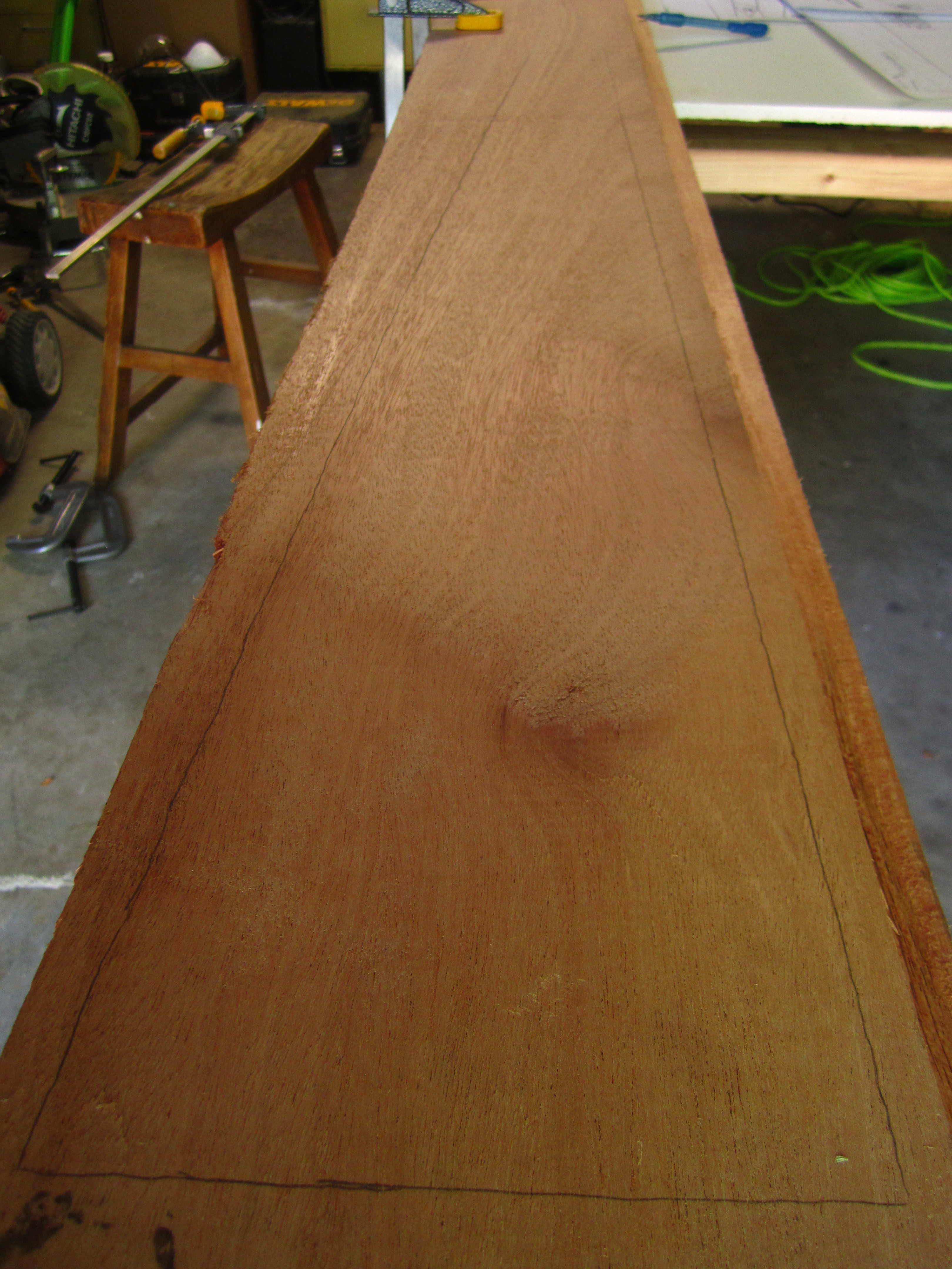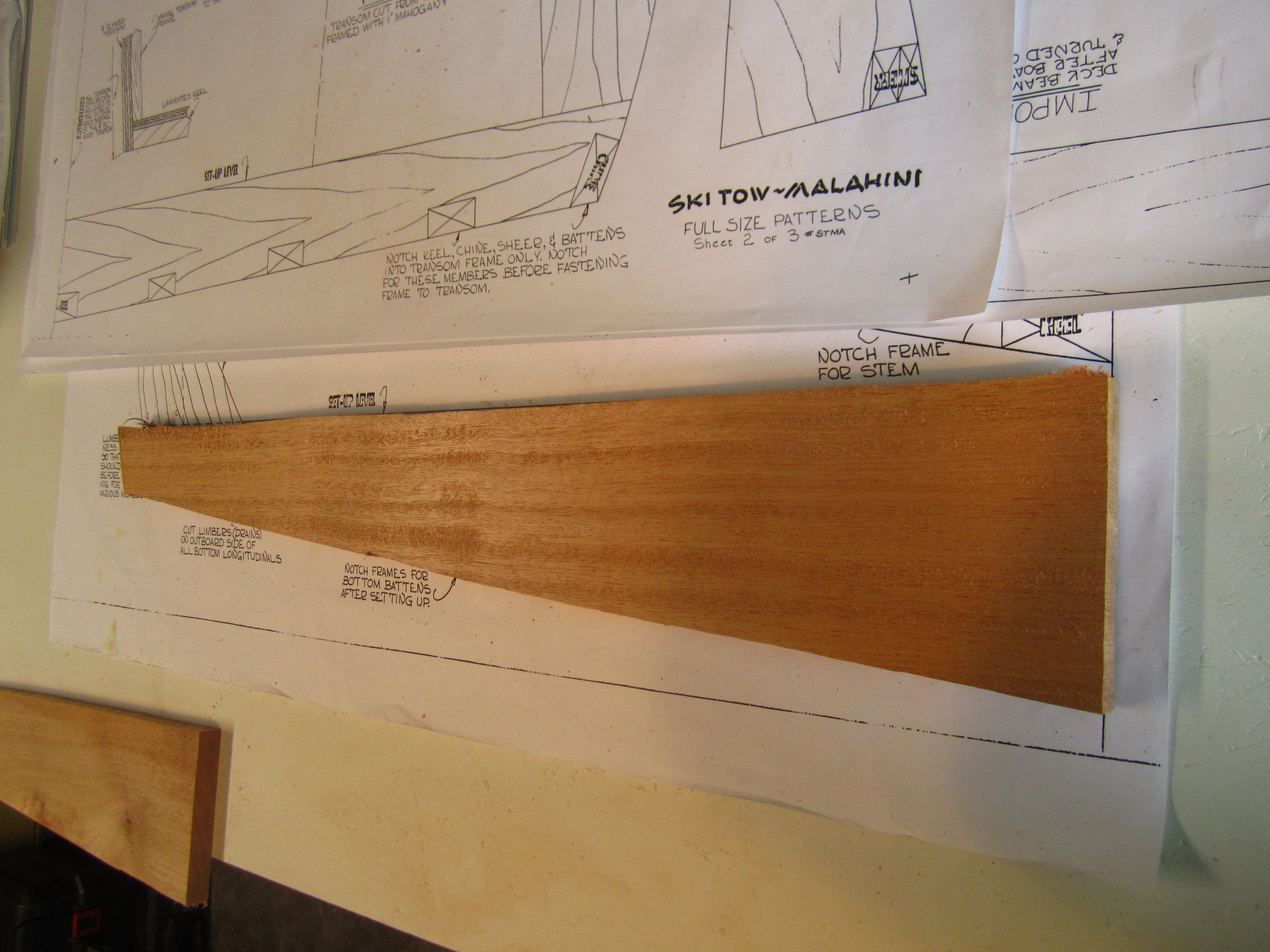 Experimenting with how best to cut the frames with test wood, it looks good and it makes this project feels like my vision is coming alive. Some notes, the book “Boatbuilding with Plywood” recommends building both sides of the frame member at once by stacking two pieces of lumber, transferring the full-size half frame, clamp both lumber boards and then cutting along the lines of the frame to get two even frame members. I did this first with a jigsaw and to cut two pieces of hardwood mahogany with a jig saw is tough and the lines were not straight at all because the toughness of the mahogany. I ended up scrapping the idea of using the jigsaw and switched to a circular saw. The advantage of the circular saw was that I got much straighter lines, which make sanding/planing afterwards much easier. It is very difficult to cut two boards of mahogany stacked on top, you need to make sure the grain of both boards are similarly aligned and that you’re cutting along the grain and not against it for a good even cut. Altogether, my test cut was much better than I thought, and putting both bottom frame members together made this dream seem so much more real.