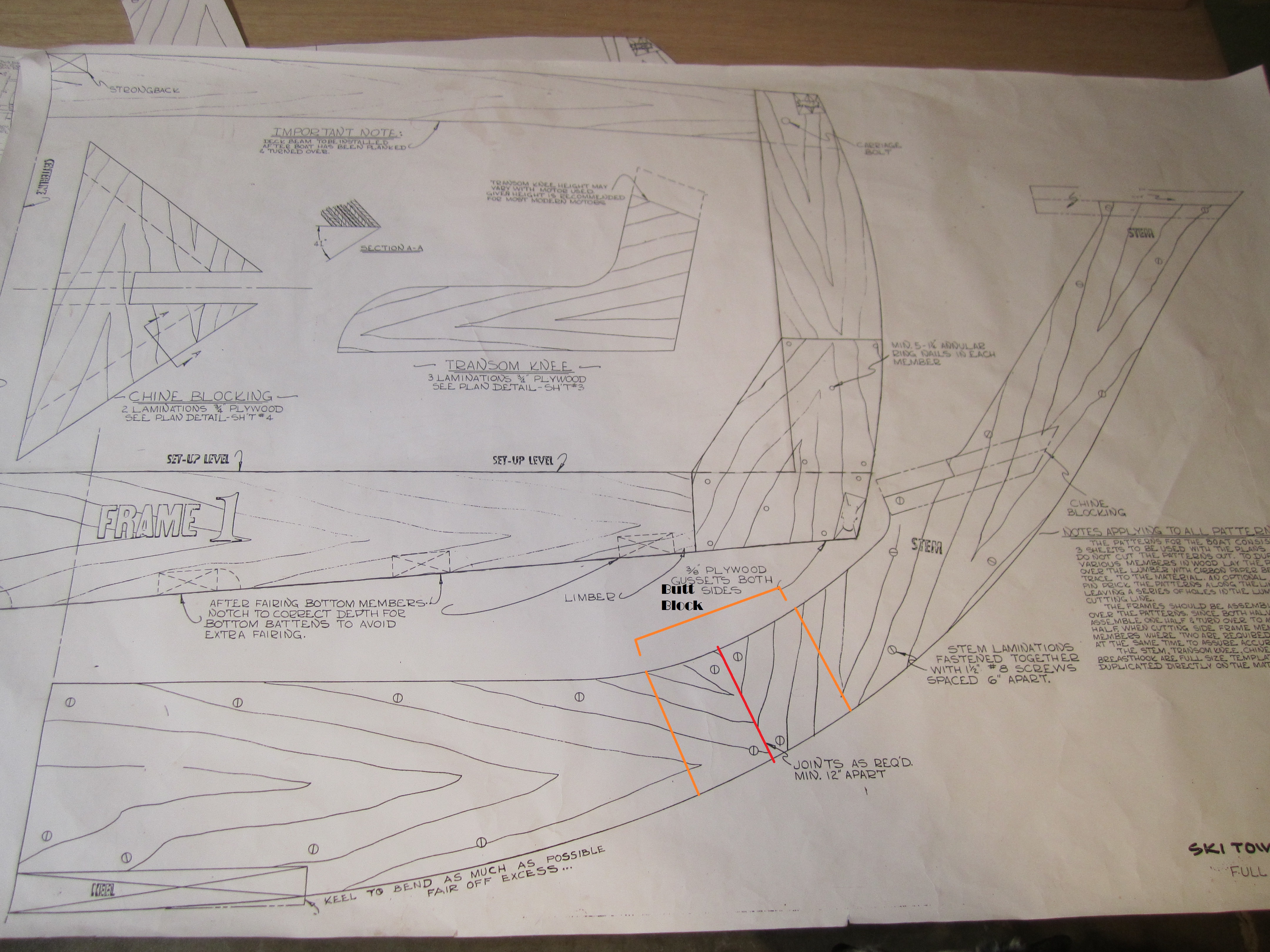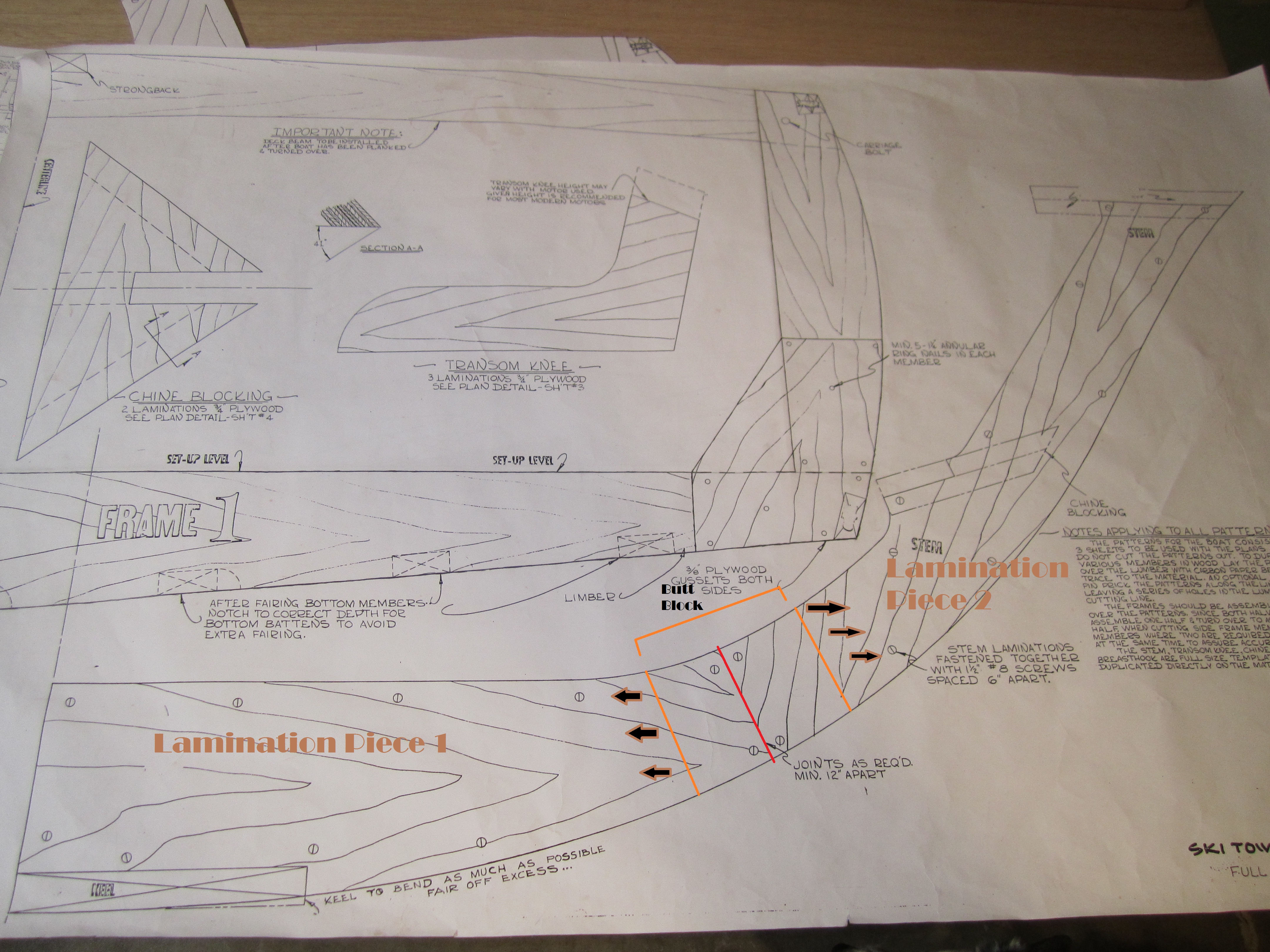 Running into some difficulties with the stem, the structure that will form the front of the boat and take in a lot of the supporting longitudinals. The plans call for a joint in the middle of the stem to even the grain direction so that cross-grain is kept to a minimum. Too much cross-grain = greater potential of splitting occurring. So below is an image of what I’m talking about, a joint line separating the two pieces of of plywood.