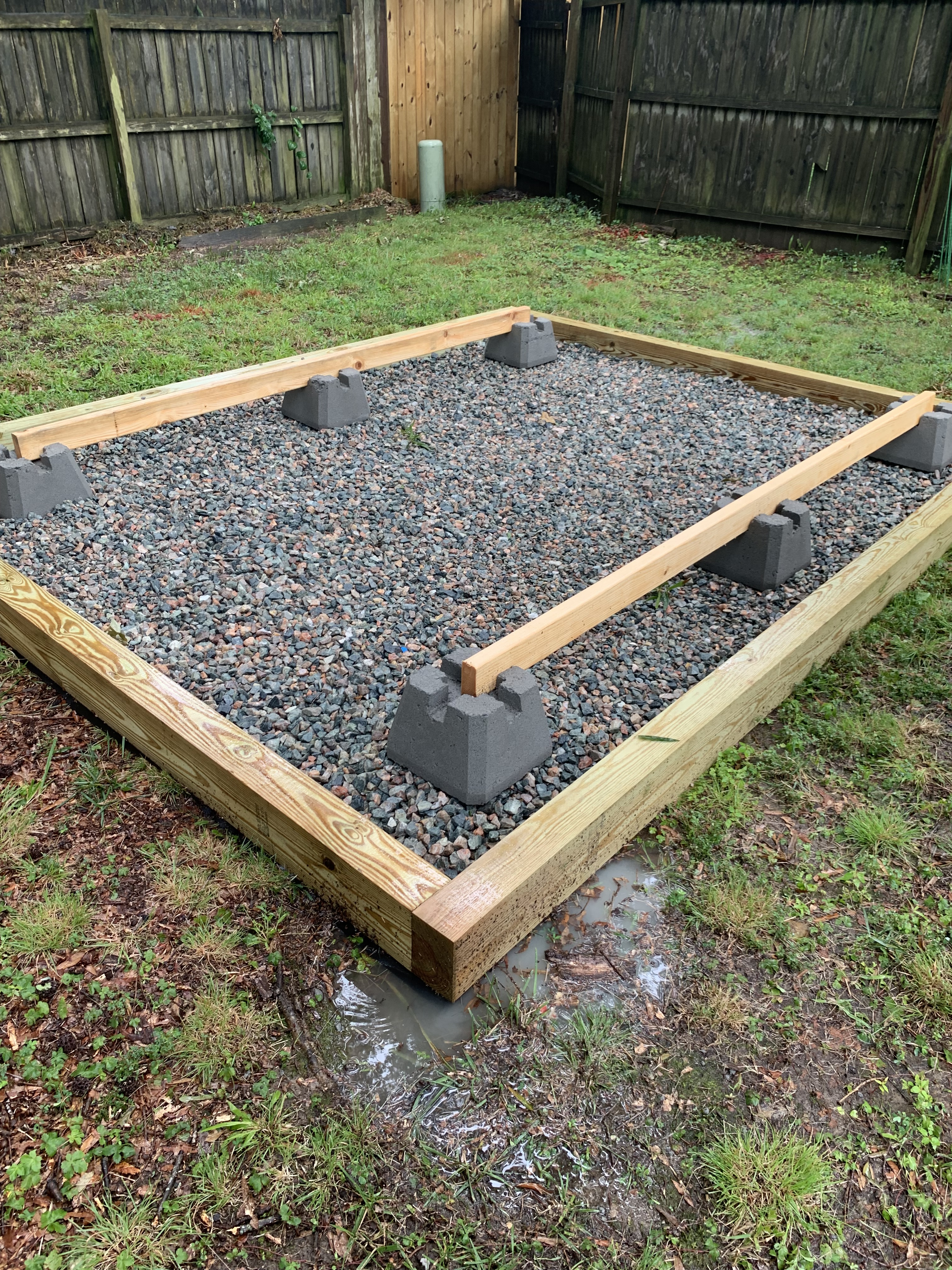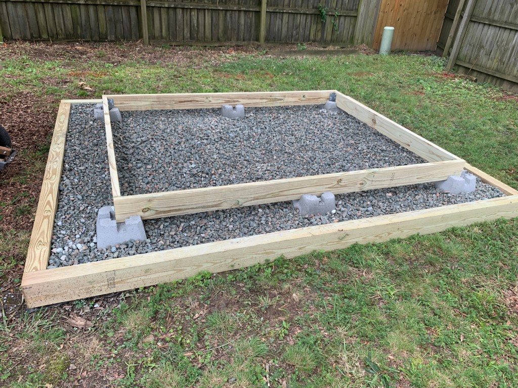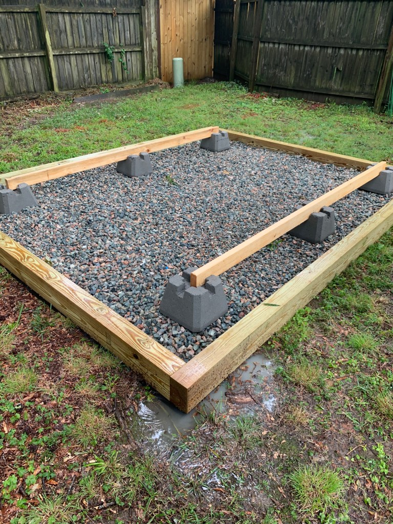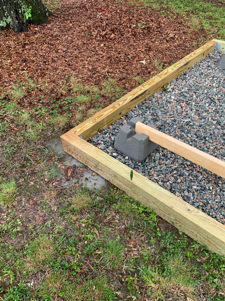If you want to build a shed that you want to last, then you have to have a solid foundation. I went with a gravel foundation for my build. When having a foundation, you want to have a clearance of 1 foot on each side. So for my 6×8 shed build, I built an 8×10 gravel foundation. Also because of this being outdoors, you want to have treated wood against all surface that contact the ground or are expected to be exposed to water. Given that Richmond can be wet and also have significant humidity, I opted for pressure-treated for all wooden surfaces.