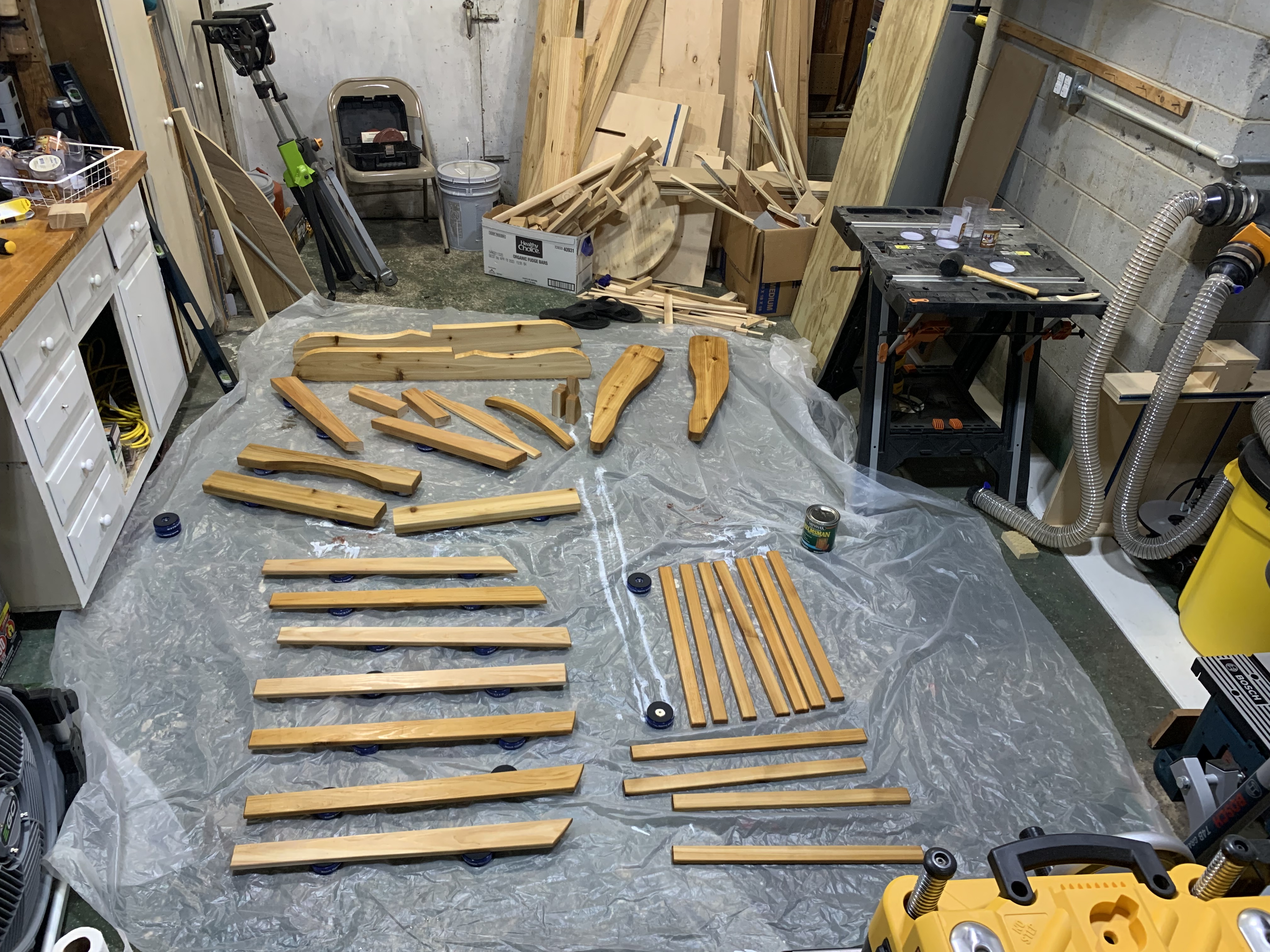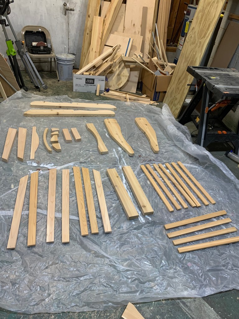 Very simple depending on the tools you have available. The plans for this chair came with cardboard templates that you can trace on your wooden pieces if you don’t have a router to do it the very easy way. In my case, the above pieces were all cut from 3/4″, 1″ and 2″ thick western red cedar.